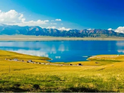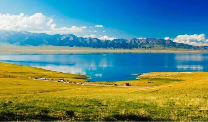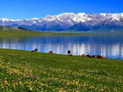 Hồ Sayram là hồ trên núi lớn và cao nhất ở Tân Cương. Trong tiếng Kazak, tên của hồ có nghĩa là “phước lành”. Nằm ở độ cao hơn 2.000 m so với mực nước biển, hồ Sayram trong xanh được bao quanh bởi đồng cỏ xanh tươi và những đỉnh núi cao phủ đầy tuyết trắng. Mặt hồ rộng 460 km2 như một tấm gương phản chiếu khung cảnh hoa, cỏ, cây lá và bầu trời. Vì vậy, ngọn núi được mệnh danh là “viên ngọc lục bảo” của Tân Cương.